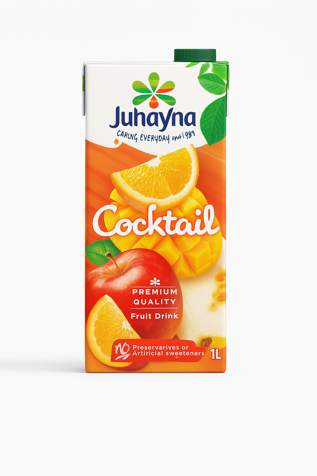 A vibrant mix of your favorite fruits in one refreshing drink! Juhayna Cocktail Fruit Drink blends the natural flavors of orange, mango, apple, and more — with no preservatives or artificial sweeteners. Premium quality, perfect for sharing with family or cooling off on a sunny day.