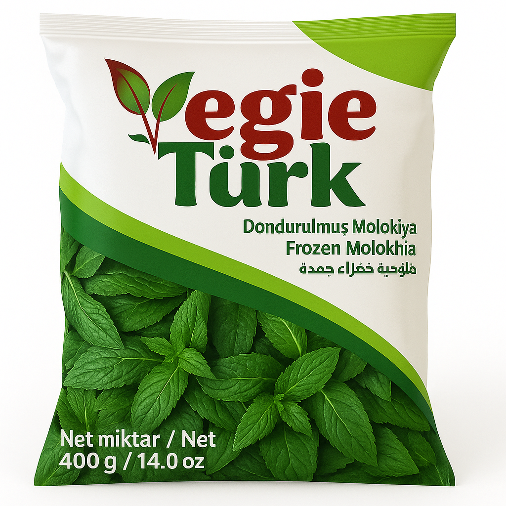Authentic minced Molokhia (Jew's Mallow), finely chopped and freshly frozen for a smooth, traditional stew base. A must-have in Middle Eastern cuisine.