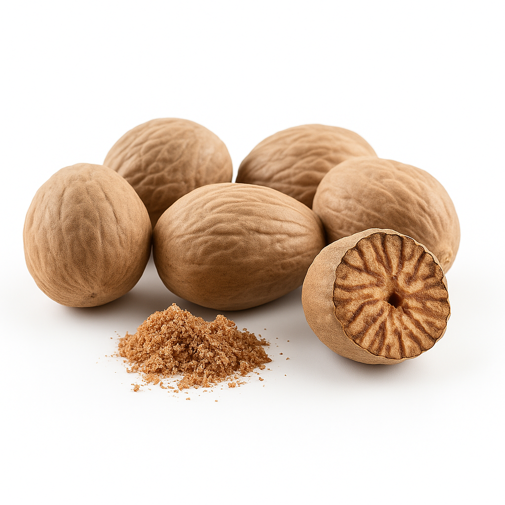 Premium whole nutmeg seeds packed with bold aroma and warm, sweet-spicy flavor. Perfect for grating fresh into desserts, curries, sauces, or beverages for intense, authentic taste.